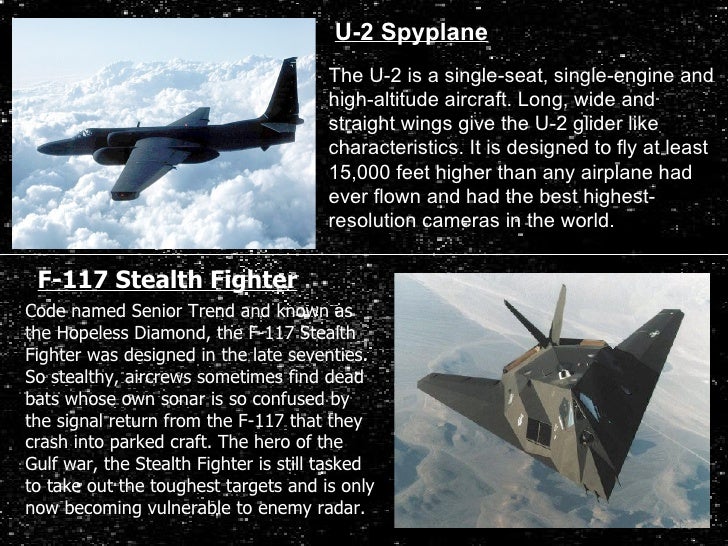 10. 10. The U-2 is a single-seat, single-engine and high-altitude aircraft. Long, wide and straight wings give the U-2 glider like characteristics. It is designed to fly at least 15,000 feet higher than any airplane had ever flown and had the best highest-resolution cameras in the world. Code named Senior Trend and known as the Hopeless Diamond, the F-117 Stealth Fighter was designed in the late seventies. So stealthy, aircrews sometimes find dead bats whose own sonar is so confused by the signal return from the F-117 that they crash into parked craft. The hero of the Gulf war, the Stealth Fighter is still tasked to take out the toughest targets and is only now becoming vulnerable to enemy radar. U-2 Spyplane F-117 Stealth Fighter