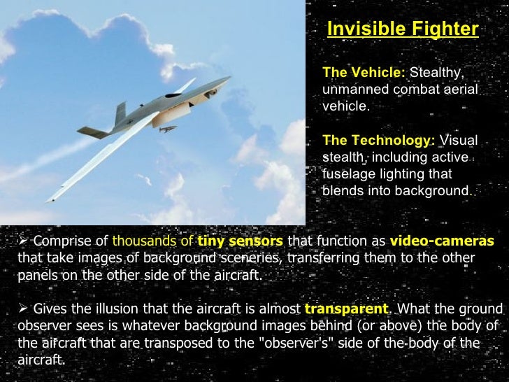 12. 12. Invisible Fighter The Vehicle: Stealthy, unmanned combat aerial vehicle. The Technology: Visual stealth, including active fuselage lighting that blends into background . <ul><li>Comprise of thousands of tiny sensors that function as video-cameras that take images of background sceneries, transferring them to the other panels on the other side of the aircraft. </li></ul><ul><li>Gives the illusion that the aircraft is almost transparent . What the ground observer sees is whatever background images behind (or above) the body of the aircraft that are transposed to the &quot;observer's&quot; side of the body of the aircraft. </li></ul>