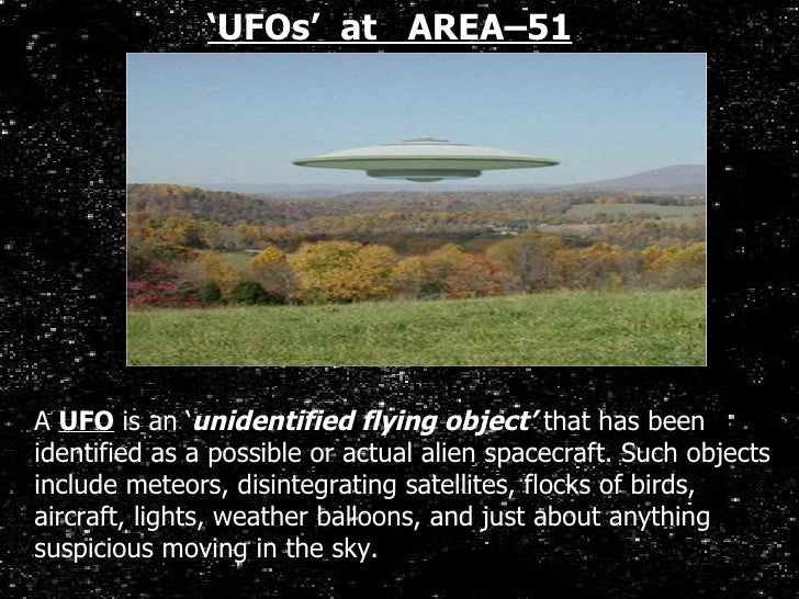 13. 13. A UFO is an ‘ unidentified flying object’ that has been identified as a possible or actual alien spacecraft. Such objects include meteors, disintegrating satellites, flocks of birds, aircraft, lights, weather balloons, and just about anything suspicious moving in the sky. ‘ UFOs’ at AREA–51