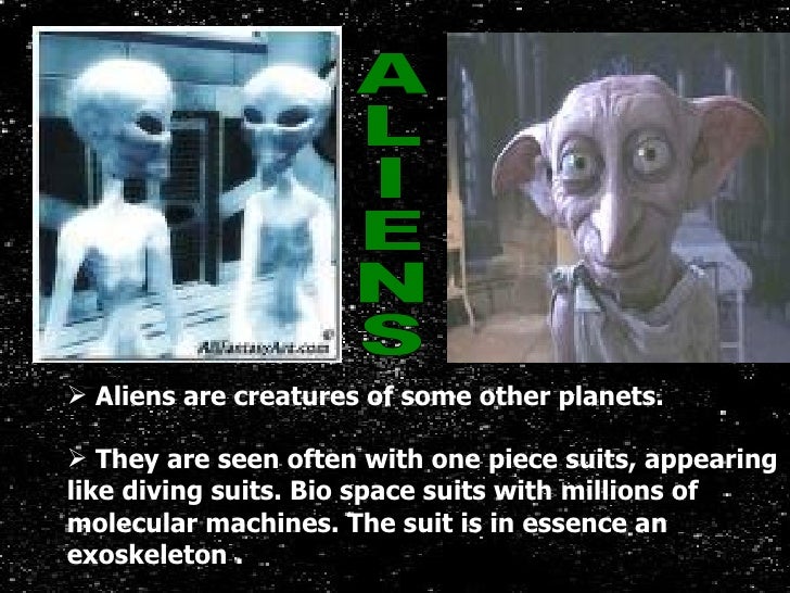 <ul><li>Aliens are creatures of some other planets. </li></ul><ul><li>They are seen often with one piece suits, appearing ...
