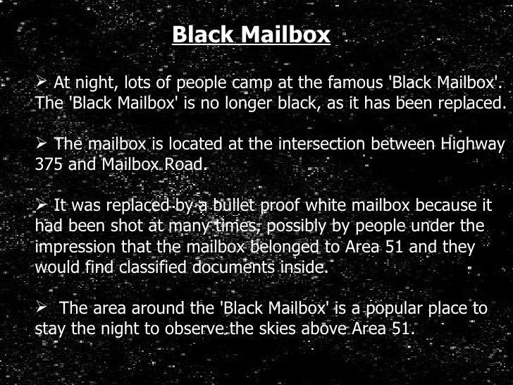 17. 17. <ul><li>At night, lots of people camp at the famous 'Black Mailbox'. The 'Black Mailbox' is no longer black, as it has been replaced. </li></ul><ul><li>The mailbox is located at the intersection between Highway 375 and Mailbox Road. </li></ul><ul><li>It was replaced by a bullet proof white mailbox because it had been shot at many times, possibly by people under the impression that the mailbox belonged to Area 51 and they would find classified documents inside. </li></ul><ul><li>The area around the 'Black Mailbox' is a popular place to stay the night to observe the skies above Area 51. </li></ul>Black Mailbox