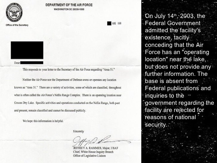 On July 14 th , 2003, the Federal Government admitted the facility's existence, tacitly conceding that the Air Force has a...