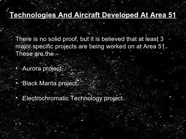7. 7. <ul><li>There is no solid proof, but it is believed that at least 3 </li></ul><ul><li>major specific projects are being worked on at Area 51. </li></ul><ul><li>These are the – </li></ul><ul><li>Aurora project. </li></ul><ul><li>Black Manta project. </li></ul><ul><li>Electrochromatic Technology project. </li></ul>Technologies And Aircraft Developed At Area 51