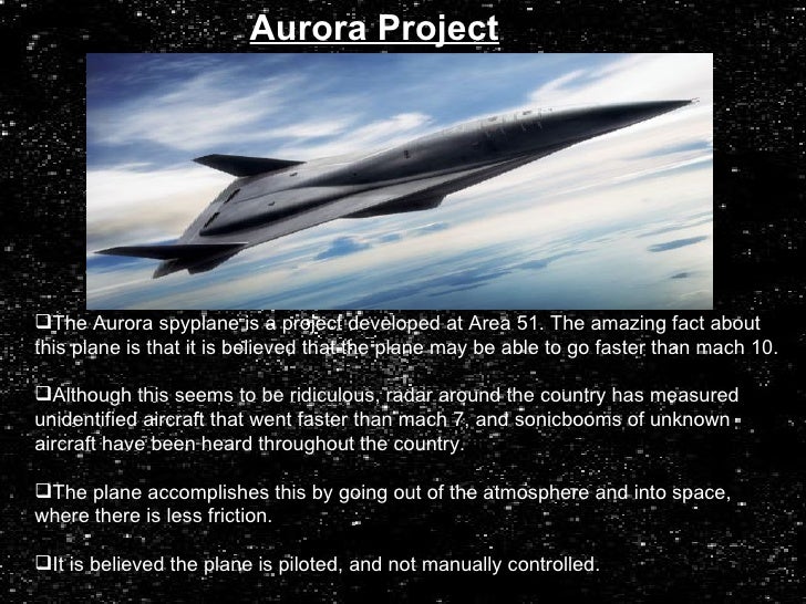 8. 8. Aurora Project <ul><li>The Aurora spyplane is a project developed at Area 51. The amazing fact about this plane is that it is believed that the plane may be able to go faster than mach 10. </li></ul><ul><li>Although this seems to be ridiculous, radar around the country has measured unidentified aircraft that went faster than mach 7, and sonicbooms of unknown aircraft have been heard throughout the country. </li></ul><ul><li>The plane accomplishes this by going out of the atmosphere and into space, where there is less friction. </li></ul><ul><li>It is believed the plane is piloted, and not manually controlled. </li></ul>