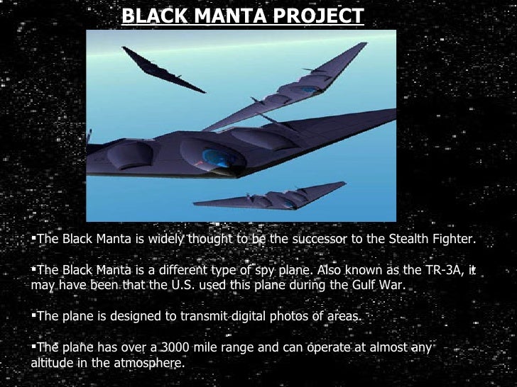 9. 9. <ul><li>The Black Manta is widely thought to be the successor to the Stealth Fighter. </li></ul><ul><li>The Black Manta is a different type of spy plane. Also known as the TR-3A, it may have been that the U.S. used this plane during the Gulf War. </li></ul><ul><li>The plane is designed to transmit digital photos of areas. </li></ul><ul><li>The plane has over a 3000 mile range and can operate at almost any altitude in the atmosphere. </li></ul>BLACK MANTA PROJECT