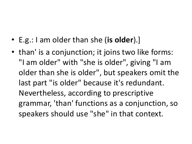 6. 6. • E.g.: I am older than she (is older).] • than' is a conjunction; it joins two like forms: "I am older" with "she is older", giving "I am older than she is older", but speakers omit the last part "is older" because it's redundant. Nevertheless, according to prescriptive grammar, 'than' functions as a conjunction, so speakers should use "she" in that context.