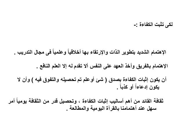 12. 12. ‫لكى تثبت الكفاءة :-‬ ‫اإلهتمام الشديد بتطوير الذات واإلرتقاء بها أخالقيا ً وعلميا ً فى مجال التدريب .‬ ‫اإلهتمام بالفريق وأخذ العهد على النفس أال تقدم له إال العلم النافع .‬ ‫أن يكون إثبات الكفاءة بصدق ( شئ أوعلم تم تحصيله والتفوق فيه ) وأن ال‬ ‫يكون إدعاءاً أو كذبا ً .‬ ‫ثقافة القائد من أهم أساليب إثبات الكفاءة ، وتحصيل قدر من الثقافة يوميا ً أمر‬ ‫سهل عند أهتمامنا بالقرآة اليومية والمطالعة .‬