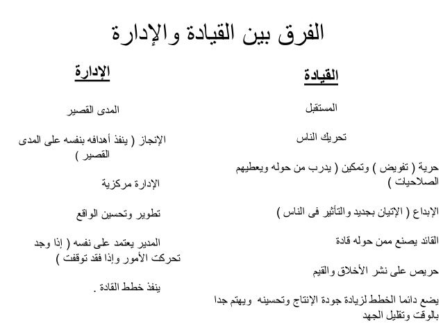 7. 7. ‫الفرق بٌن القٌادة واإلدارة‬ ‫القيادة‬ ‫اإلدارة‬ ‫المستقبل‬ ‫المدى القصٌر‬ ‫تحرٌك الناس‬ ‫اإلنجاز ( ٌنفذ أهدافه بنفسه على المدى‬ ‫القصٌر )‬ ‫حرٌة ( تفوٌض ) وتمكٌن ( ٌدرب من حوله وٌعطٌهم‬ ‫الصالحٌات )‬ ‫اإلدارة مركزٌة‬ ‫اإلبداع ( اإلتٌان بجدٌد والتأثٌر فى الناس )‬ ‫تطوٌر وتحسٌن الواقع‬ ‫القائد ٌصنع ممن حوله قادة‬ ‫حرٌص على نشر األخالق والقٌم‬ ‫ٌضع دائما الخطط لزٌادة جودة اإلنتاج وتحسٌنه وٌهتم جدا‬ ‫بالوقت وتقلٌل الجهد‬ ‫المدٌر ٌعتمد على نفسه ( إذا وجد‬ ‫تحركت األمور وإذا فقد توقفت )‬ ‫ٌنفذ خطط القادة .‬