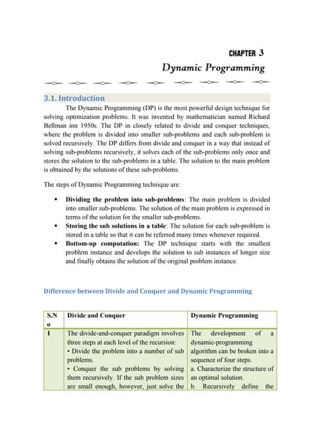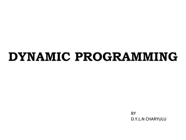1. 1. 1 Dynamic Programming (DP) • Like divide-and-conquer, solve problem by combining the solutions to sub-problems. • Differences between divide-and-conquer and DP: – Independent sub-problems, solve sub-problems independently and recursively, (so same sub(sub)problems solved repeatedly) – Sub-problems are dependent, i.e., sub-problems share sub-sub-problems, every sub(sub)problem solved just once, solutions to sub(sub)problems are stored in a table and used for solving higher level sub-problems.