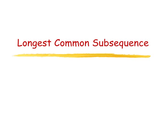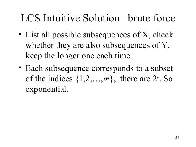 39. 39. 39 LCS Intuitive Solution –brute force • List all possible subsequences of X, check whether they are also subsequences of Y, keep the longer one each time. • Each subsequence corresponds to a subset of the indices {1,2,…,m}, there are 2m . So exponential.
