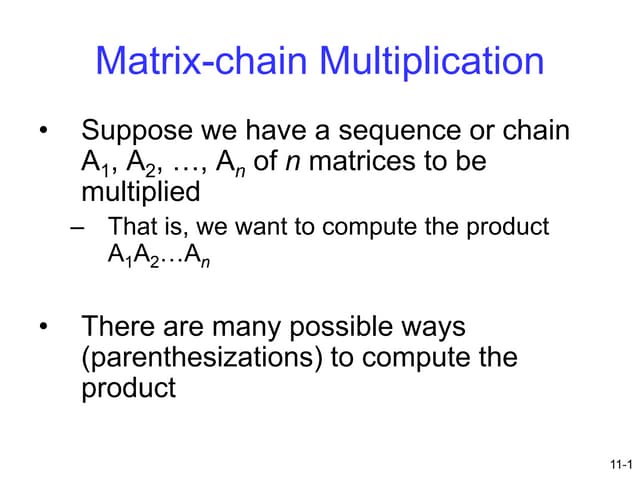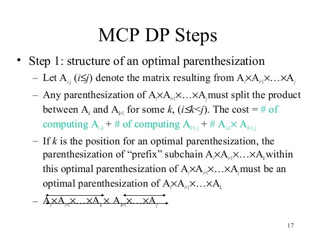 17. 17. 17 MCP DP Steps • Step 1: structure of an optimal parenthesization – Let Ai..j (i≤j) denote the matrix resulting from Ai×Ai+1×…×Aj – Any parenthesization of Ai×Ai+1×…×Ajmust split the product between Ak and Ak+1 for some k, (i≤k<j). The cost = # of computing Ai..k + # of computing Ak+1..j + # Ai..k × Ak+1..j. – If k is the position for an optimal parenthesization, the parenthesization of “prefix” subchain Ai×Ai+1×…×Akwithin this optimal parenthesization of Ai×Ai+1×…×Aj must be an optimal parenthesization of Ai×Ai+1×…×Ak. – Ai×Ai+1×…×Ak × Ak+1×…×Aj