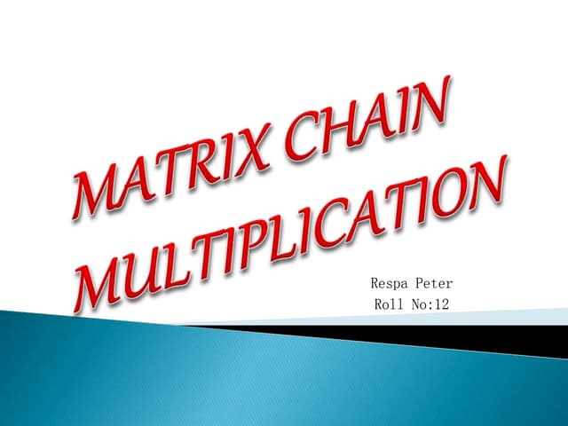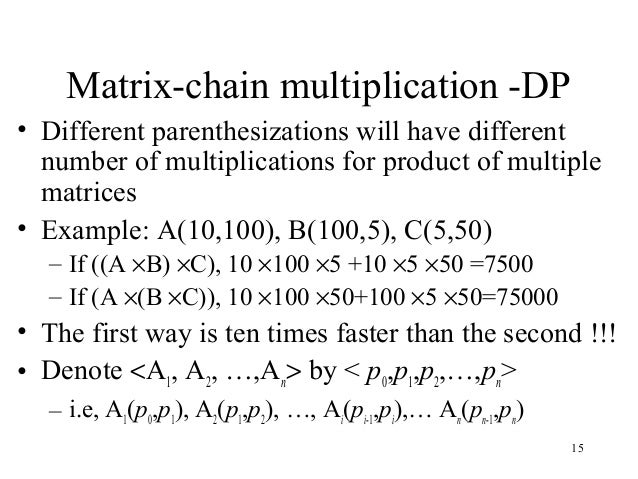 15. 15. 15 Matrix-chain multiplication -DP • Different parenthesizations will have different number of multiplications for product of multiple matrices • Example: A(10,100), B(100,5), C(5,50) – If ((A ×B) ×C), 10 ×100 ×5 +10 ×5 ×50 =7500 – If (A ×(B ×C)), 10 ×100 ×50+100 ×5 ×50=75000 • The first way is ten times faster than the second !!! • Denote <A1, A2, …,An> by < p0,p1,p2,…,pn> – i.e, A1(p0,p1), A2(p1,p2), …, Ai(pi-1,pi),… An(pn-1,pn)