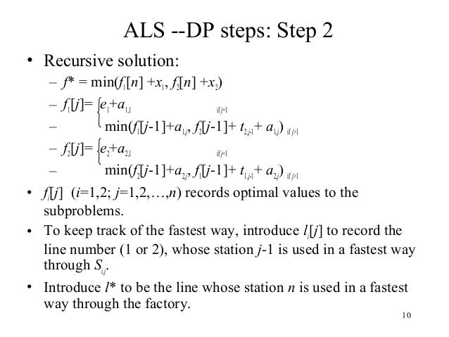 10. 10. 10 ALS --DP steps: Step 2 • Recursive solution: – f* = min(f1[n] +x1, f2[n] +x2) – f1[j]= e1+a1,1 if j=1 – min(f1[j-1]+a1,j, f2[j-1]+ t2,j-1+ a1,j) ifj>1 – f2[j]= e2+a2,1 if j=1 – min(f2[j-1]+a2,j, f1[j-1]+ t1,j-1+ a2,j) ifj>1 • fi[j] (i=1,2; j=1,2,…,n) records optimal values to the subproblems. • To keep track of the fastest way, introduce li[j] to record the line number (1 or 2), whose station j-1 is used in a fastest way through Si,j. • Introduce l* to be the line whose station n is used in a fastest way through the factory.