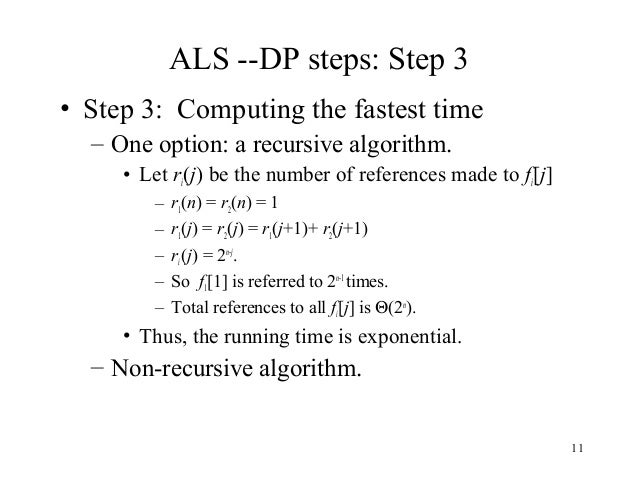 11. 11. 11 ALS --DP steps: Step 3 • Step 3: Computing the fastest time – One option: a recursive algorithm. • Let ri(j) be the number of references made to fi[j] – r1(n) = r2(n) = 1 – r1(j) = r2(j) = r1(j+1)+ r2(j+1) – ri(j) = 2n-j . – So f1[1] is referred to 2n-1 times. – Total references to all fi[j] is Θ(2n ). • Thus, the running time is exponential. – Non-recursive algorithm.