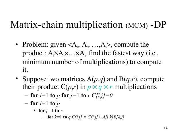 14. 14. 14 Matrix-chain multiplication (MCM) -DP • Problem: given <A1, A2, …,An>, compute the product: A1×A2×…×An,find the fastest way (i.e., minimum number of multiplications) to compute it. • Suppose two matrices A(p,q) and B(q,r), compute their product C(p,r) in p × q × r multiplications – for i=1 to p for j=1 to r C[i,j]=0 – for i=1 to p • for j=1 to r – for k=1 to q C[i,j] = C[i,j]+ A[i,k]B[k,j]