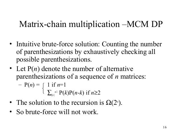 16. 16. 16 Matrix-chain multiplication –MCM DP • Intuitive brute-force solution: Counting the number of parenthesizations by exhaustively checking all possible parenthesizations. • Let P(n) denote the number of alternative parenthesizations of a sequence of n matrices: – P(n) = 1 if n=1 ∑k=1 n-1 P(k)P(n-k) if n≥2 • The solution to the recursion is Ω(2n ). • So brute-force will not work.