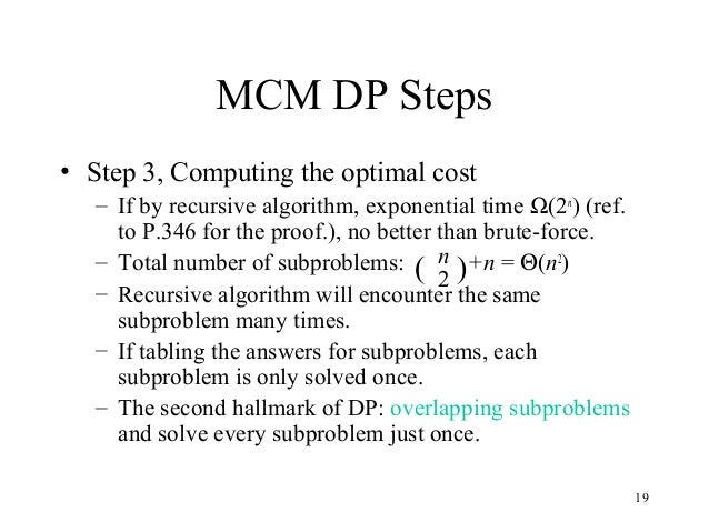 19. 19. 19 MCM DP Steps • Step 3, Computing the optimal cost – If by recursive algorithm, exponential time Ω(2n ) (ref. to P.346 for the proof.), no better than brute-force. – Total number of subproblems: +n = Θ(n2 ) – Recursive algorithm will encounter the same subproblem many times. – If tabling the answers for subproblems, each subproblem is only solved once. – The second hallmark of DP: overlapping subproblems and solve every subproblem just once. ( )n 2