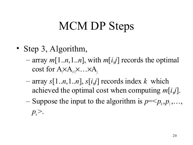 20. 20. 20 MCM DP Steps • Step 3, Algorithm, – array m[1..n,1..n], with m[i,j] records the optimal cost for Ai×Ai+1×…×Aj. – array s[1..n,1..n], s[i,j] records index k which achieved the optimal cost when computing m[i,j]. – Suppose the input to the algorithm is p=<p0,p1,…, pn>.