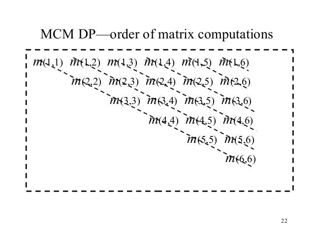 22. 22. 22 MCM DP—order of matrix computations m(1,1) m(1,2) m(1,3) m(1,4) m(1,5) m(1,6) m(2,2) m(2,3) m(2,4) m(2,5) m(2,6) m(3,3) m(3,4) m(3,5) m(3,6) m(4,4) m(4,5) m(4,6) m(5,5) m(5,6) m(6,6)