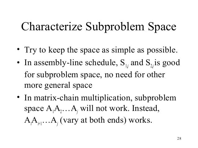 28. 28. 28 Characterize Subproblem Space • Try to keep the space as simple as possible. • In assembly-line schedule, S1,j and S2,jis good for subproblem space, no need for other more general space • In matrix-chain multiplication, subproblem space A1A2…Aj will not work. Instead, AiAi+1…Aj (vary at both ends) works.