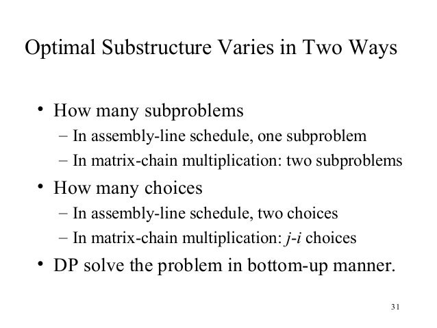 31. 31. 31 Optimal Substructure Varies in Two Ways • How many subproblems – In assembly-line schedule, one subproblem – In matrix-chain multiplication: two subproblems • How many choices – In assembly-line schedule, two choices – In matrix-chain multiplication: j-i choices • DP solve the problem in bottom-up manner.