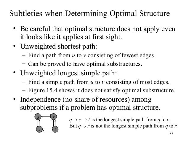 33. 33. 33 Subtleties when Determining Optimal Structure • Be careful that optimal structure does not apply even it looks like it applies at first sight. • Unweighted shortest path: – Find a path from u to v consisting of fewest edges. – Can be proved to have optimal substructures. • Unweighted longest simple path: – Find a simple path from u to v consisting of most edges. – Figure 15.4 shows it does not satisfy optimal substructure. • Independence (no share of resources) among subproblems if a problem has optimal structure. q s r t q→ r → t is the longest simple path from q to t. But q→ r is not the longest simple path from q to r.