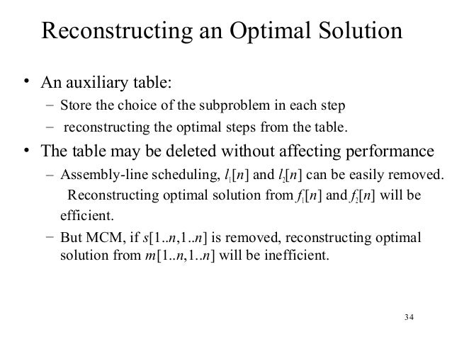34. 34. 34 Reconstructing an Optimal Solution • An auxiliary table: – Store the choice of the subproblem in each step – reconstructing the optimal steps from the table. • The table may be deleted without affecting performance – Assembly-line scheduling, l1[n] and l2[n] can be easily removed. Reconstructing optimal solution from f1[n] and f2[n] will be efficient. – But MCM, if s[1..n,1..n] is removed, reconstructing optimal solution from m[1..n,1..n] will be inefficient.