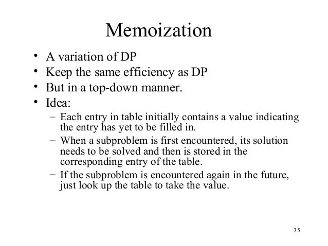 35. 35. 35 Memoization • A variation of DP • Keep the same efficiency as DP • But in a top-down manner. • Idea: – Each entry in table initially contains a value indicating the entry has yet to be filled in. – When a subproblem is first encountered, its solution needs to be solved and then is stored in the corresponding entry of the table. – If the subproblem is encountered again in the future, just look up the table to take the value.
