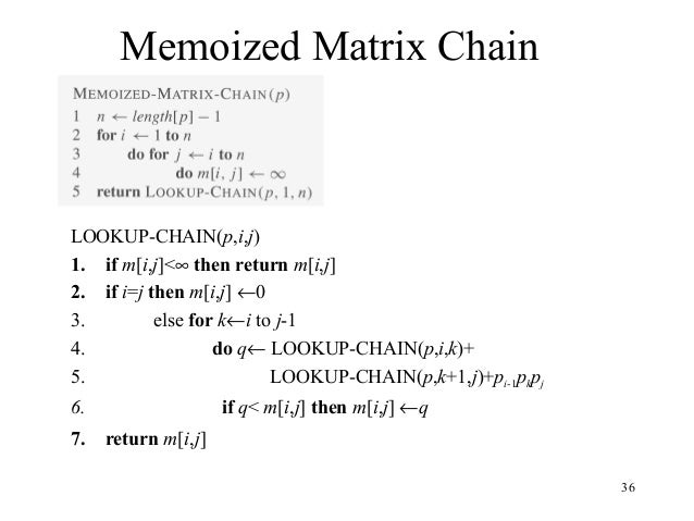 36. 36. 36 Memoized Matrix Chain LOOKUP-CHAIN(p,i,j) 1. if m[i,j]<∞ then return m[i,j] 2. if i=j then m[i,j] ←0 3. else for k←i to j-1 4. do q← LOOKUP-CHAIN(p,i,k)+ 5. LOOKUP-CHAIN(p,k+1,j)+pi-1pkpj 6. if q< m[i,j] then m[i,j] ←q 7. return m[i,j]