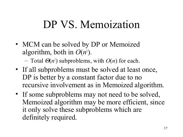 37. 37. 37 DP VS. Memoization • MCM can be solved by DP or Memoized algorithm, both in O(n3 ). – Total Θ(n2 ) subproblems, with O(n) for each. • If all subproblems must be solved at least once, DP is better by a constant factor due to no recursive involvement as in Memoized algorithm. • If some subproblems may not need to be solved, Memoized algorithm may be more efficient, since it only solve these subproblems which are definitely required.