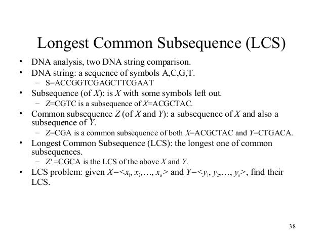 38. 38. 38 Longest Common Subsequence (LCS) • DNA analysis, two DNA string comparison. • DNA string: a sequence of symbols A,C,G,T. – S=ACCGGTCGAGCTTCGAAT • Subsequence (of X): is X with some symbols left out. – Z=CGTC is a subsequence of X=ACGCTAC. • Common subsequence Z (of X and Y): a subsequence of X and also a subsequence of Y. – Z=CGA is a common subsequence of both X=ACGCTAC and Y=CTGACA. • Longest Common Subsequence (LCS): the longest one of common subsequences. – Z' =CGCA is the LCS of the above X and Y. • LCS problem: given X=<x1, x2,…, xm> and Y=<y1, y2,…, yn>, find their LCS.