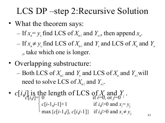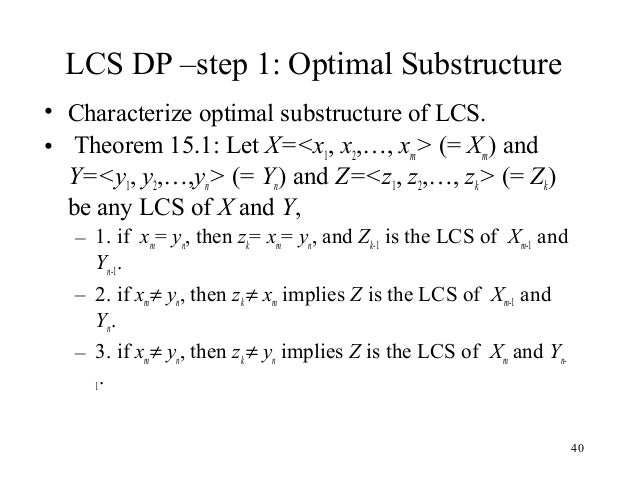 40. 40. 40 LCS DP –step 1: Optimal Substructure • Characterize optimal substructure of LCS. • Theorem 15.1: Let X=<x1, x2,…, xm> (= Xm) and Y=<y1, y2,…,yn> (= Yn) and Z=<z1, z2,…, zk> (= Zk) be any LCS of X and Y, – 1. if xm= yn, then zk= xm= yn, and Zk-1 is the LCS of Xm-1 and Yn-1. – 2. if xm≠ yn, then zk ≠ xm implies Z is the LCS of Xm-1 and Yn. – 3. if xm≠ yn, then zk ≠ yn implies Z is the LCS of Xm and Yn- 1.