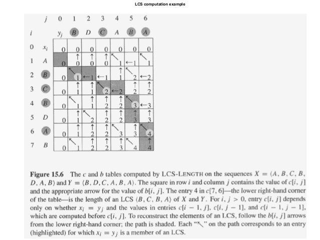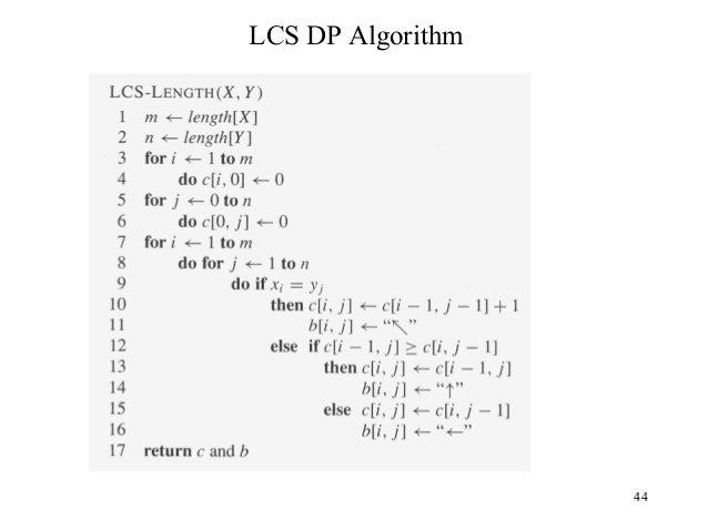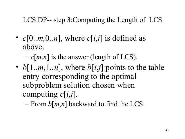 42. 42. 42 LCS DP-- step 3:Computing the Length of LCS • c[0..m,0..n], where c[i,j] is defined as above. – c[m,n] is the answer (length of LCS). • b[1..m,1..n], where b[i,j] points to the table entry corresponding to the optimal subproblem solution chosen when computing c[i,j]. – From b[m,n] backward to find the LCS.