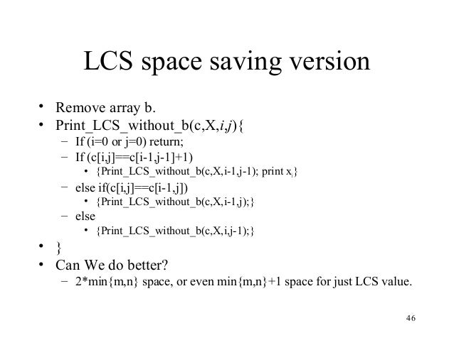 46. 46. 46 LCS space saving version • Remove array b. • Print_LCS_without_b(c,X,i,j){ – If (i=0 or j=0) return; – If (c[i,j]==c[i-1,j-1]+1) • {Print_LCS_without_b(c,X,i-1,j-1); print xi} – else if(c[i,j]==c[i-1,j]) • {Print_LCS_without_b(c,X,i-1,j);} – else • {Print_LCS_without_b(c,X,i,j-1);} • } • Can We do better? – 2*min{m,n} space, or even min{m,n}+1 space for just LCS value.