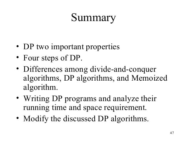47. 47. 47 Summary • DP two important properties • Four steps of DP. • Differences among divide-and-conquer algorithms, DP algorithms, and Memoized algorithm. • Writing DP programs and analyze their running time and space requirement. • Modify the discussed DP algorithms.