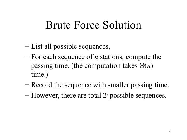 6. 6. 6 Brute Force Solution – List all possible sequences, – For each sequence of n stations, compute the passing time. (the computation takes Θ(n) time.) – Record the sequence with smaller passing time. – However, there are total 2n possible sequences.