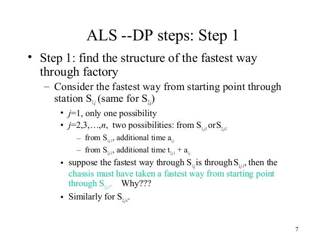 7. 7. 7 ALS --DP steps: Step 1 • Step 1: find the structure of the fastest way through factory – Consider the fastest way from starting point through station S1,j (same for S2,j) • j=1, only one possibility • j=2,3,…,n, two possibilities: from S1,j-1 orS2,j-1 – from S1,j-1, additional time a1,j – from S2,j-1, additional time t2,j-1 + a1,j • suppose the fastest way through S1,jis throughS1,j-1, then the chassis must have taken a fastest way from starting point through S1,j-1. Why??? • Similarly for S2,j-1.