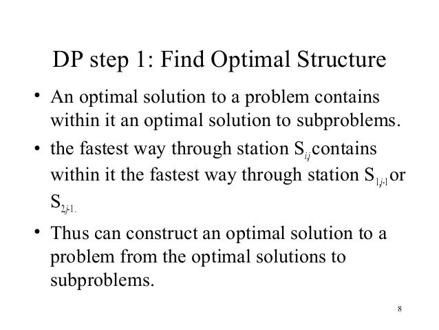 8. 8. 8 DP step 1: Find Optimal Structure • An optimal solution to a problem contains within it an optimal solution to subproblems. • the fastest way through station Si,jcontains within it the fastest way through station S1,j-1or S2,j-1. • Thus can construct an optimal solution to a problem from the optimal solutions to subproblems.