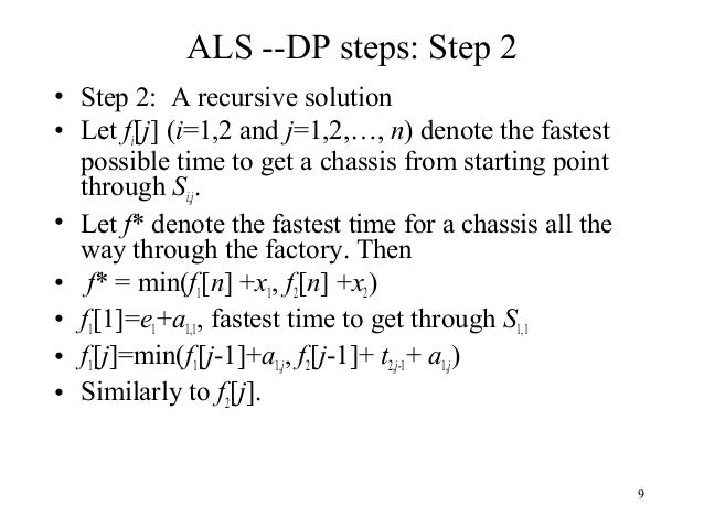 9. 9. 9 ALS --DP steps: Step 2 • Step 2: A recursive solution • Let fi[j] (i=1,2 and j=1,2,…, n) denote the fastest possible time to get a chassis from starting point through Si,j. • Let f* denote the fastest time for a chassis all the way through the factory. Then • f* = min(f1[n] +x1, f2[n] +x2) • f1[1]=e1+a1,1, fastest time to get through S1,1 • f1[j]=min(f1[j-1]+a1,j, f2[j-1]+ t2,j-1+ a1,j) • Similarly to f2[j].
