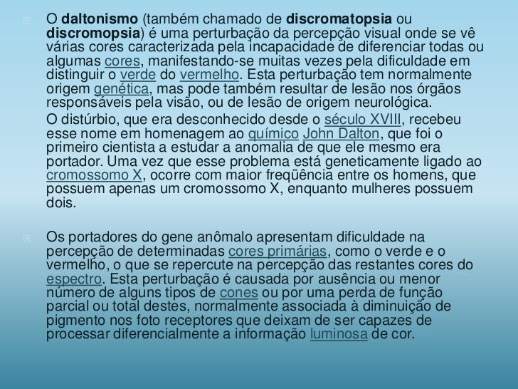 1. 1.  O daltonismo (também chamado de discromatopsia ou discromopsia) é uma perturbação da percepção visual onde se vê várias cores caracterizada pela incapacidade de diferenciar todas ou algumas cores, manifestando-se muitas vezes pela dificuldade em distinguir o verde do vermelho. Esta perturbação tem normalmente origem genética, mas pode também resultar de lesão nos órgãos responsáveis pela visão, ou de lesão de origem neurológica. O distúrbio, que era desconhecido desde o século XVIII, recebeu esse nome em homenagem ao químico John Dalton, que foi o primeiro cientista a estudar a anomalia de que ele mesmo era portador. Uma vez que esse problema está geneticamente ligado ao cromossomo X, ocorre com maior freqüência entre os homens, que possuem apenas um cromossomo X, enquanto mulheres possuem dois. Os portadores do gene anômalo apresentam dificuldade na percepção de determinadas cores primárias, como o verde e o vermelho, o que se repercute na percepção das restantes cores do espectro. Esta perturbação é causada por ausência ou menor número de alguns tipos de cones ou por uma perda de função parcial ou total destes, normalmente associada à diminuição de pigmento nos foto receptores que deixam de ser capazes de processar diferencialmente a informação luminosa de cor.