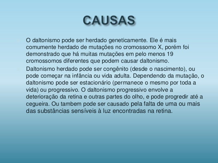 2. 2.  O daltonismo pode ser herdado geneticamente. Ele é mais comumente herdado de mutações no cromossomo X, porém foi demonstrado que há muitas mutações em pelo menos 19 cromossomos diferentes que podem causar daltonismo. Daltonismo herdado pode ser congênito (desde o nascimento), ou pode começar na infância ou vida adulta. Dependendo da mutação, o daltonismo pode ser estacionário (permanece o mesmo por toda a vida) ou progressivo. O daltonismo progressivo envolve a deterioração da retina e outras partes do olho, e pode progredir até a cegueira. Ou tambem pode ser causado pela falta de uma ou mais das substâncias sensíveis à luz encontradas na retina.