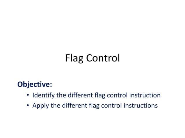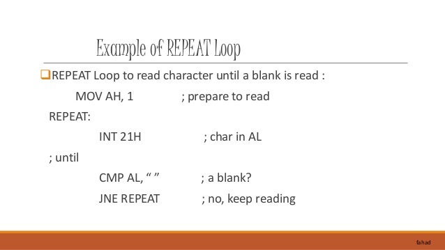 19. 19. Example of REPEAT Loop REPEAT Loop to read character until a blank is read : MOV AH, 1 ; prepare to read REPEAT: INT 21H ; char in AL ; until CMP AL, “ ” ; a blank? JNE REPEAT ; no, keep reading fahad