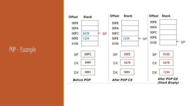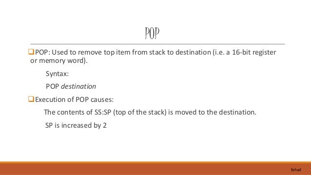 10. 10. POP POP: Used to remove top item from stack to destination (i.e. a 16-bit register or memory word). Syntax: POP destination Execution of POP causes: The contents of SS:SP (top of the stack) is moved to the destination. SP is increased by 2 fahad