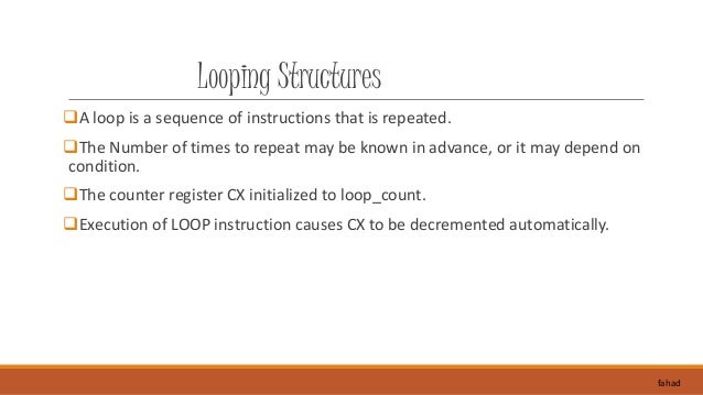 13. 13. Looping Structures A loop is a sequence of instructions that is repeated. The Number of times to repeat may be known in advance, or it may depend on condition. The counter register CX initialized to loop_count. Execution of LOOP instruction causes CX to be decremented automatically. fahad