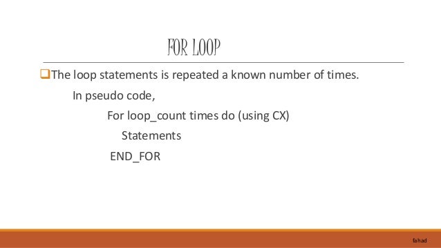 14. 14. FOR LOOP The loop statements is repeated a known number of times. In pseudo code, For loop_count times do (using CX) Statements END_FOR fahad