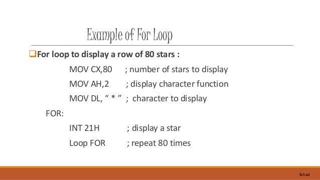 15. 15. Example of For Loop For loop to display a row of 80 stars : MOV CX,80 ; number of stars to display MOV AH,2 ; display character function MOV DL, “ * ” ; character to display FOR: INT 21H ; display a star Loop FOR ; repeat 80 times fahad