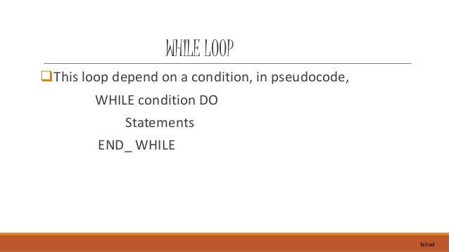 16. 16. WHILE LOOP This loop depend on a condition, in pseudocode, WHILE condition DO Statements END_ WHILE fahad