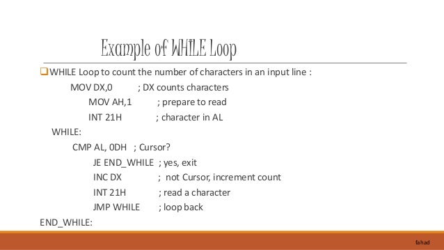 17. 17. Example of WHILE Loop WHILE Loop to count the number of characters in an input line : MOV DX,0 ; DX counts characters MOV AH,1 ; prepare to read INT 21H ; character in AL WHILE: CMP AL, 0DH ; Cursor? JE END_WHILE ; yes, exit INC DX ; not Cursor, increment count INT 21H ; read a character JMP WHILE ; loop back END_WHILE: fahad
