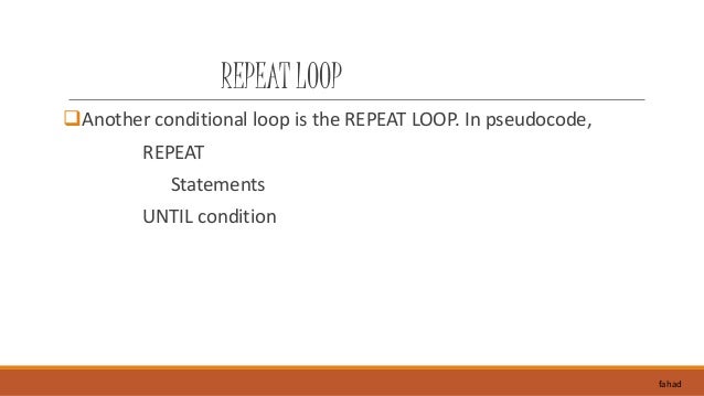18. 18. REPEAT LOOP Another conditional loop is the REPEAT LOOP. In pseudocode, REPEAT Statements UNTIL condition fahad