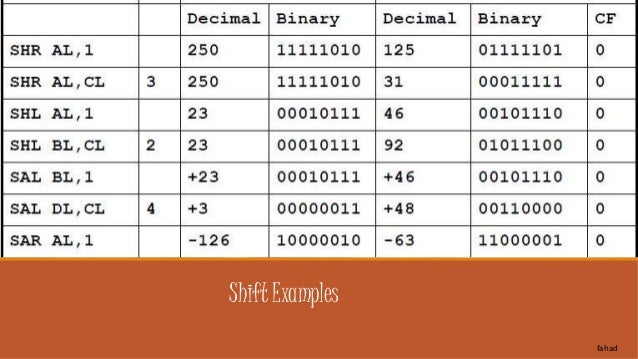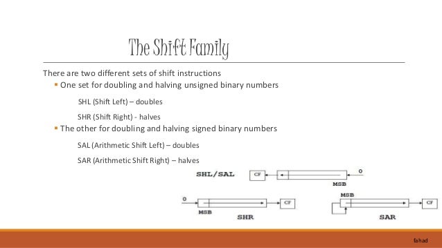 3. 3. The Shift Family There are two different sets of shift instructions  One set for doubling and halving unsigned binary numbers SHL (Shift Left) – doubles SHR (Shift Right) - halves  The other for doubling and halving signed binary numbers SAL (Arithmetic Shift Left) – doubles SAR (Arithmetic Shift Right) – halves fahad